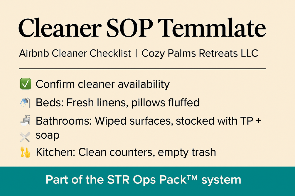 ✔ 1-Page Cleaner Turnover Checklist (PDF) ✔ Step-by-step tasks for consistent turnovers ✔ Works with any cleaner, anywhere